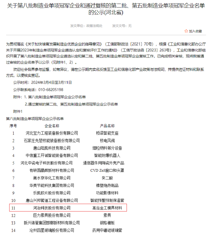 根據《工業和信息化部辦公廳關于開展2023年制造業單項冠軍企業遴選認定和復核評價工作的通知》(工信廳政法函〔2023263號),工業和信息化部組織開展了第八批制造業單項冠軍企業遴選認定和第二批、第五批制造業單項冠軍企業復核工作,已完成相關審核,河冶科技股份有限公司被認定為第八批制造業單項冠軍企業。