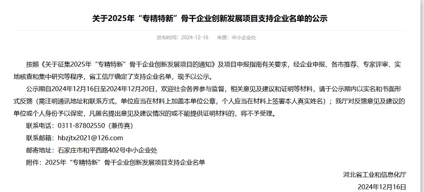 公司入圍河北省“專精特新”骨干企業創先發展項目名單